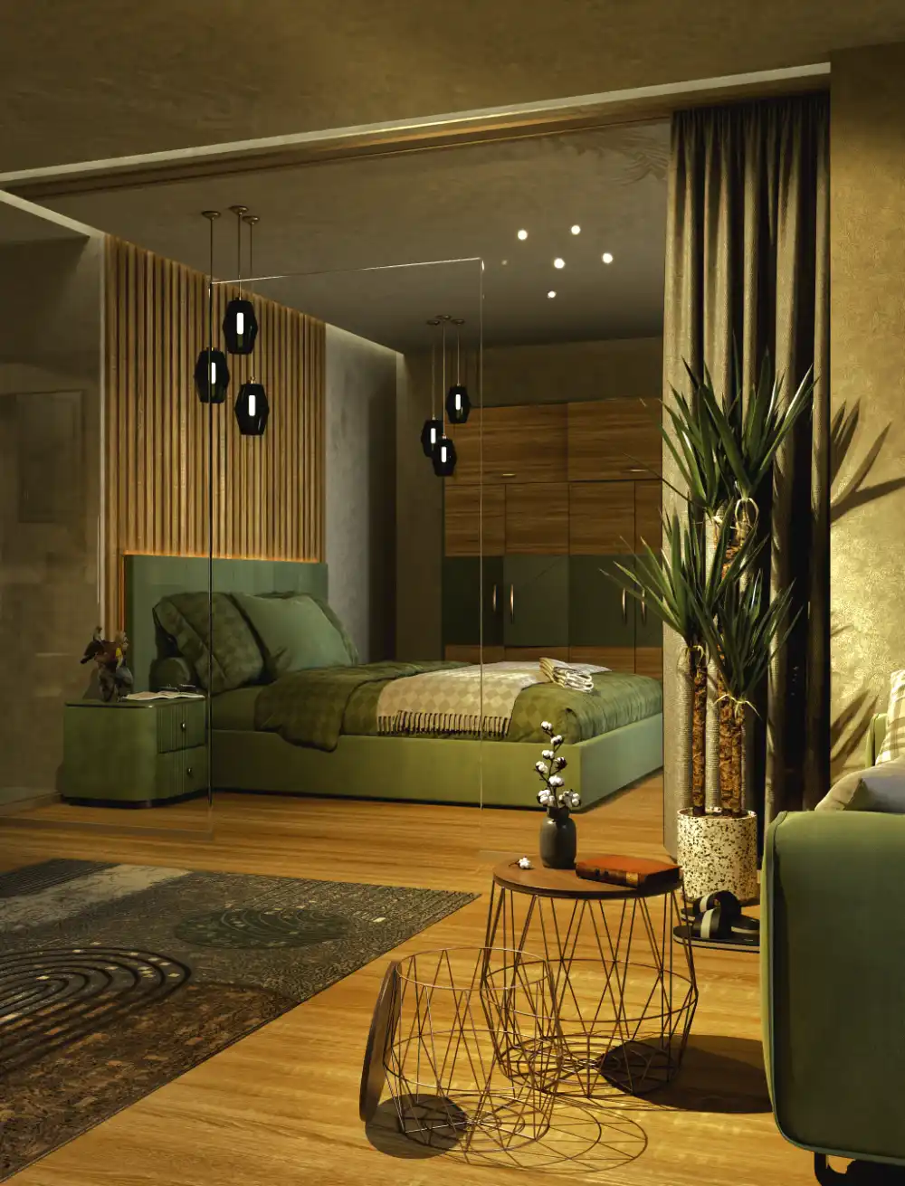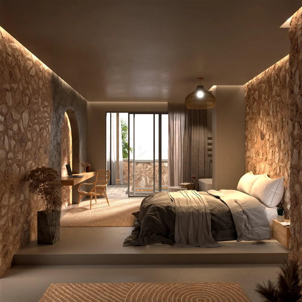 Warm Mediterranean-inspired bedroom featuring natural stone walls, soft lighting, and minimal design. The scene was modeled and rendered in Blender with a focus on realistic materials, lighting, and real-world scale to create a calm and cozy architectural space.