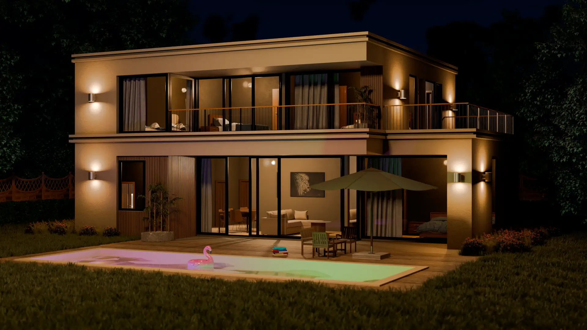 A modern house exterior visualized in Blender, featuring clean architecture, large glass openings, and a warm, natural material palette. The scene focuses on realistic lighting and atmosphere, capturing the space in both daytime and nighttime conditions to highlight mood and detail.