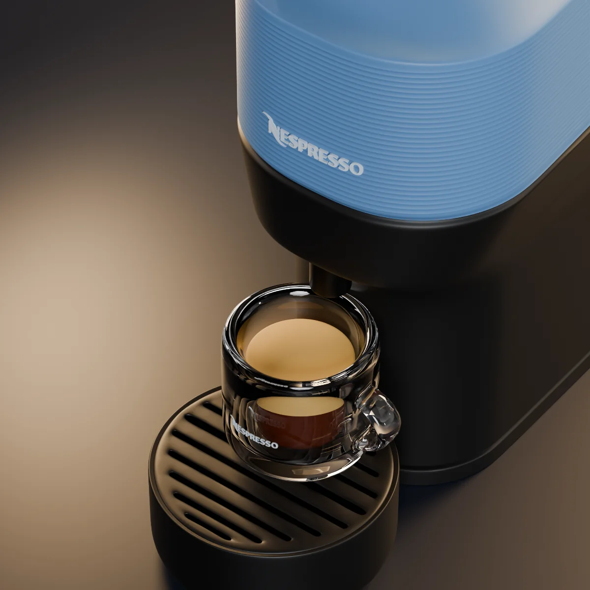 This blue edition of the Nespresso Vertuo explores a different presentation style, using lighting and composition to enhance the richness of the color and surface detail. The scene was designed to elevate the product visually while maintaining realism and brand consistency.